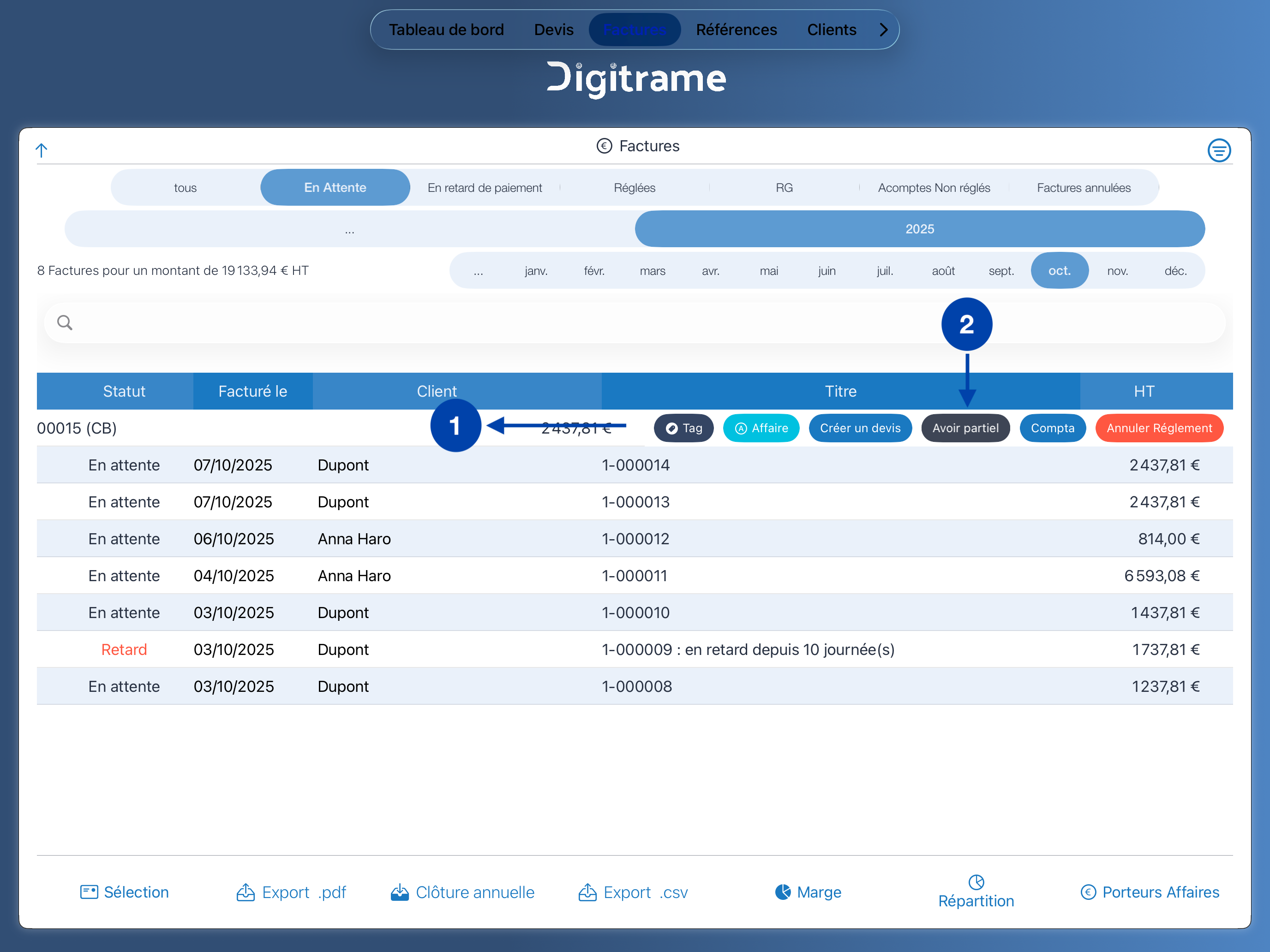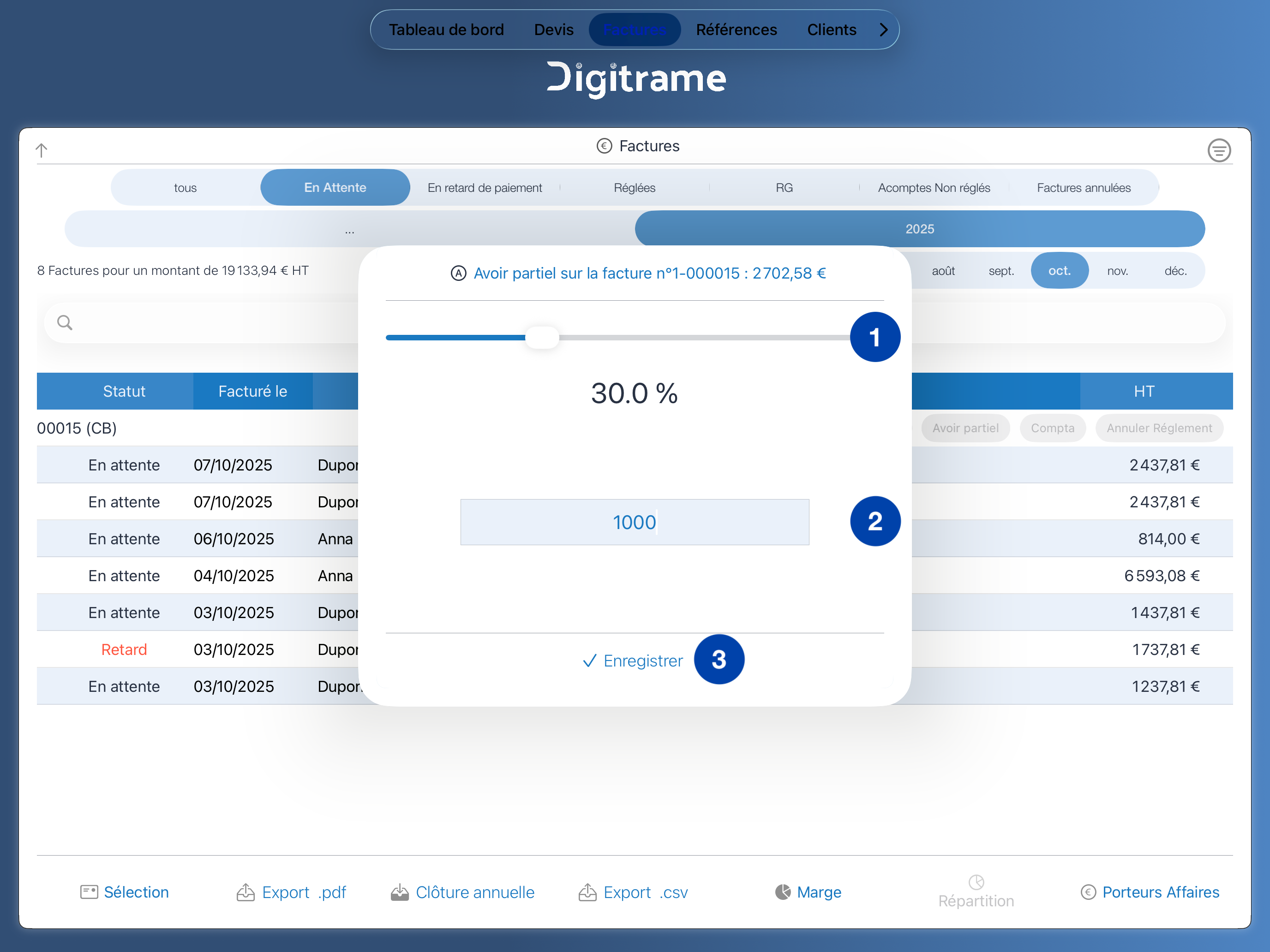 Dans la liste des factures, effectuez un glissement vers la gauche sur la facture en question.