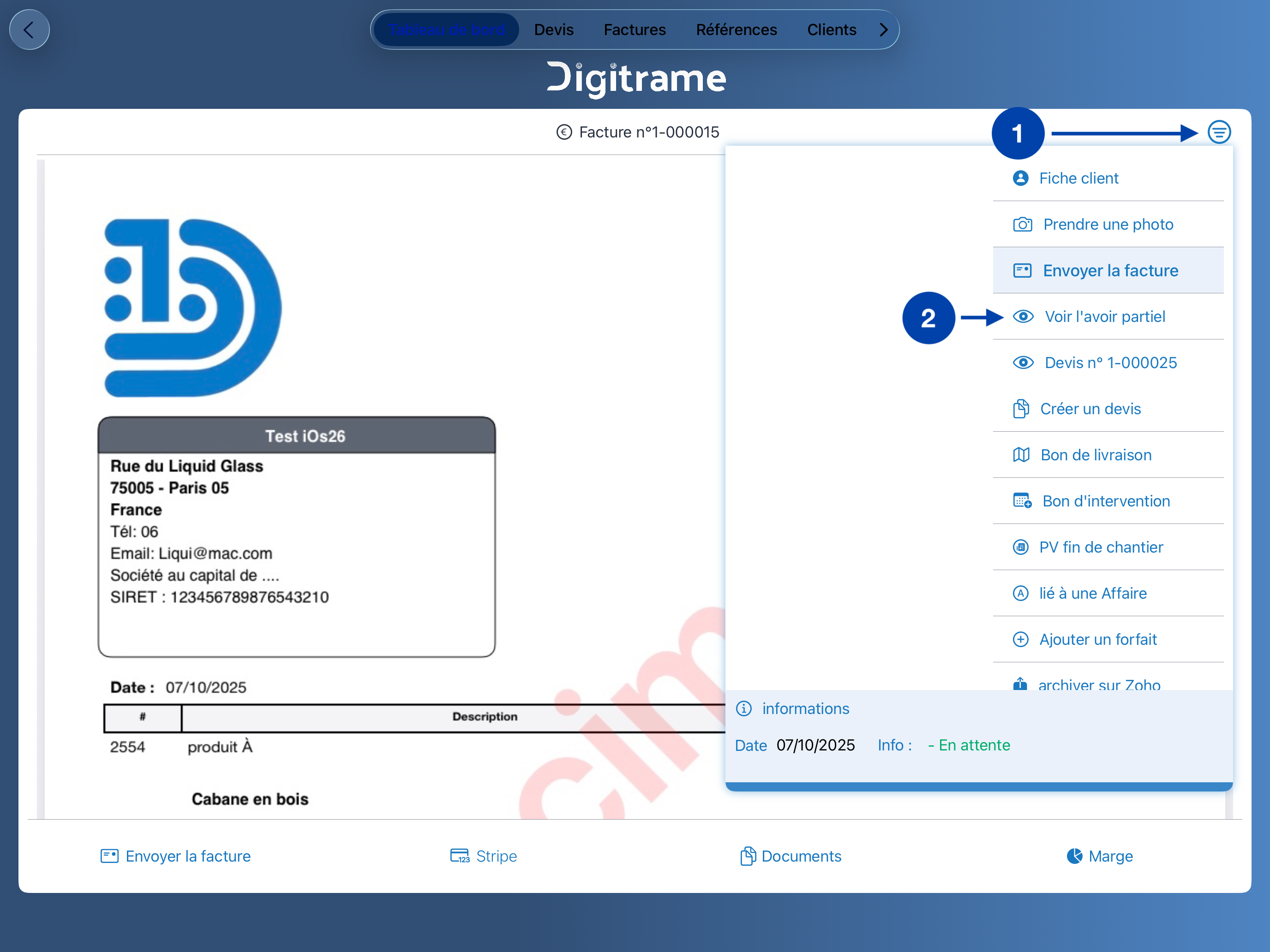 Vous pouvez rééditer l’avoir à tout moment depuis la consultation de la facture, via le menu d’options (en haut à droite).