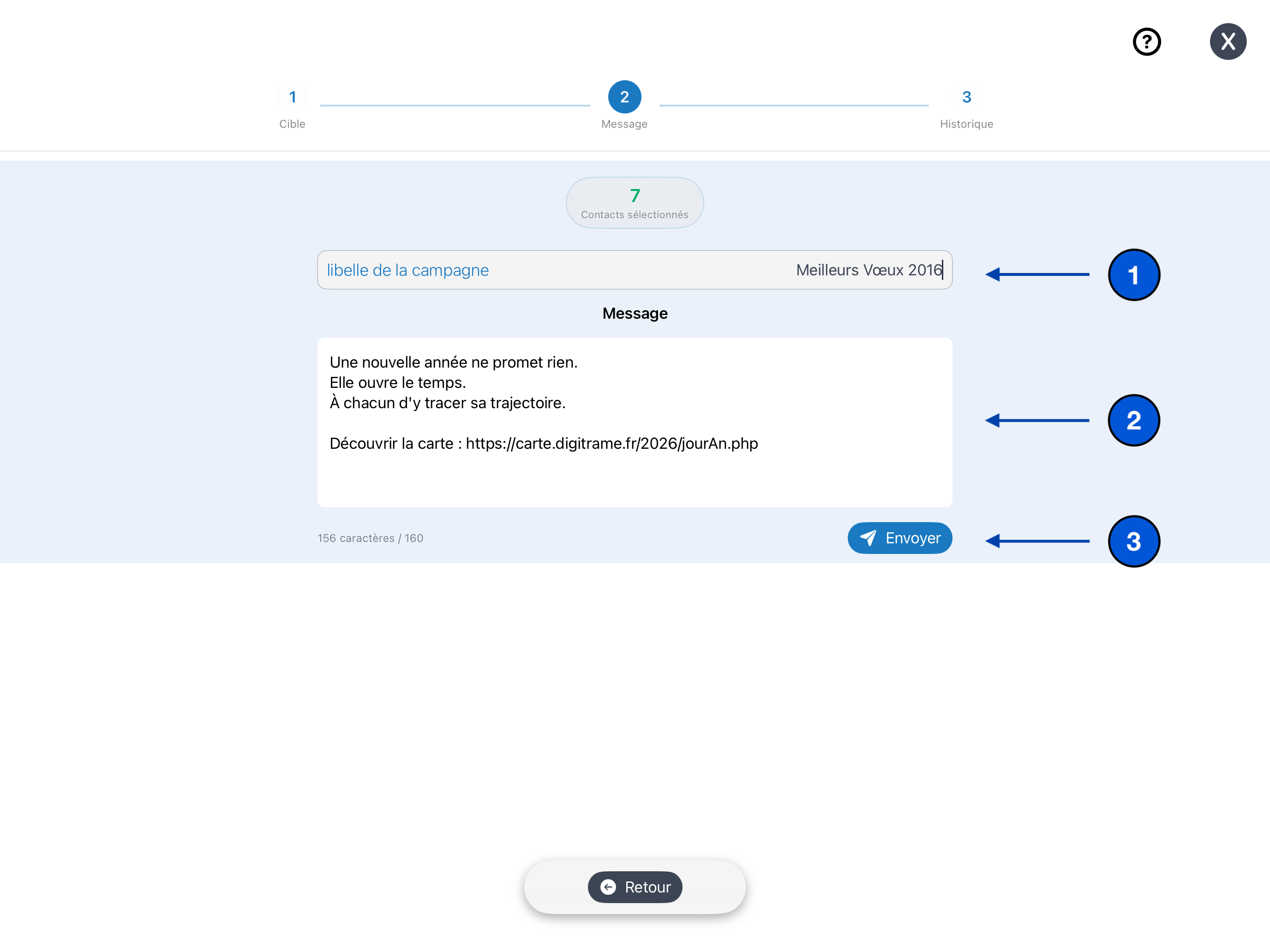 Saisissez un nom de campagne : Il vous permet d’identifier facilement vos envois dans l’historique (ex. : Rappel rendez-vous, Info exceptionnelle, Promo printemps).