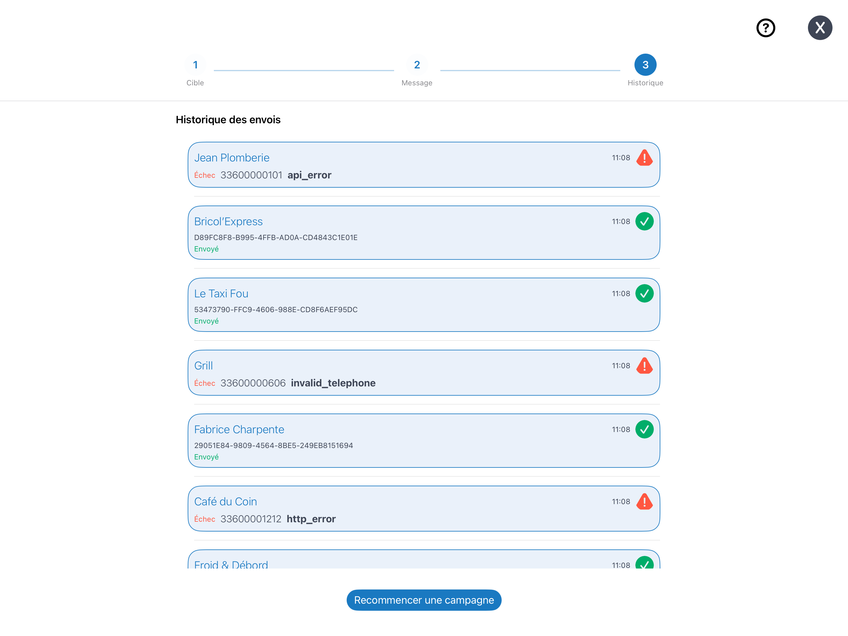 messages envoyés, dates et listes de destinataires avec un indicateur (vert pour valider que le message soit bien envoyé, ou rouge en cas de souci avec message d'alerte en fonction de l'erreur