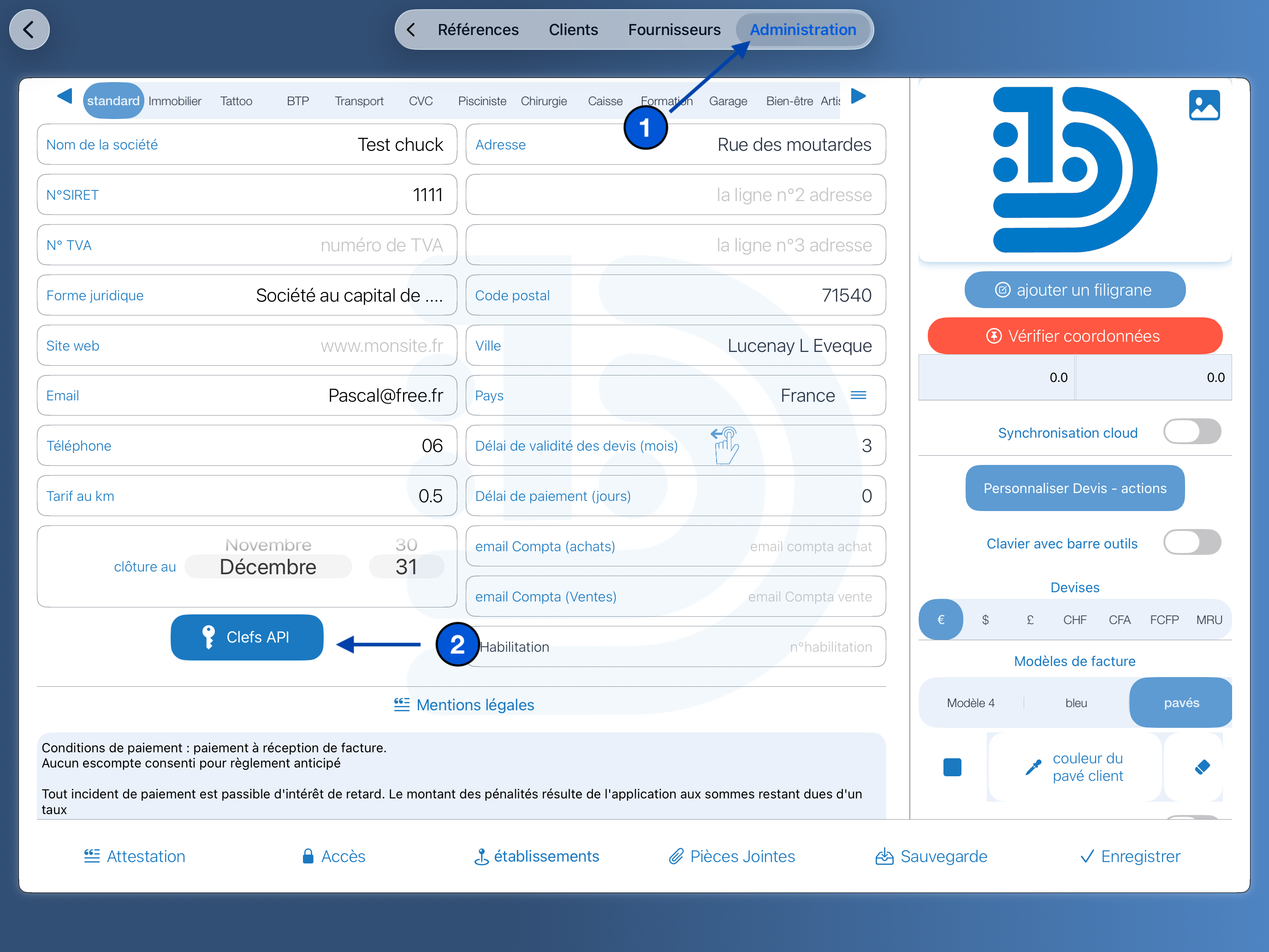 Une fois la clé API obtenue, rendez-vous dans : Administration → Mes informations → Clé API → SMS