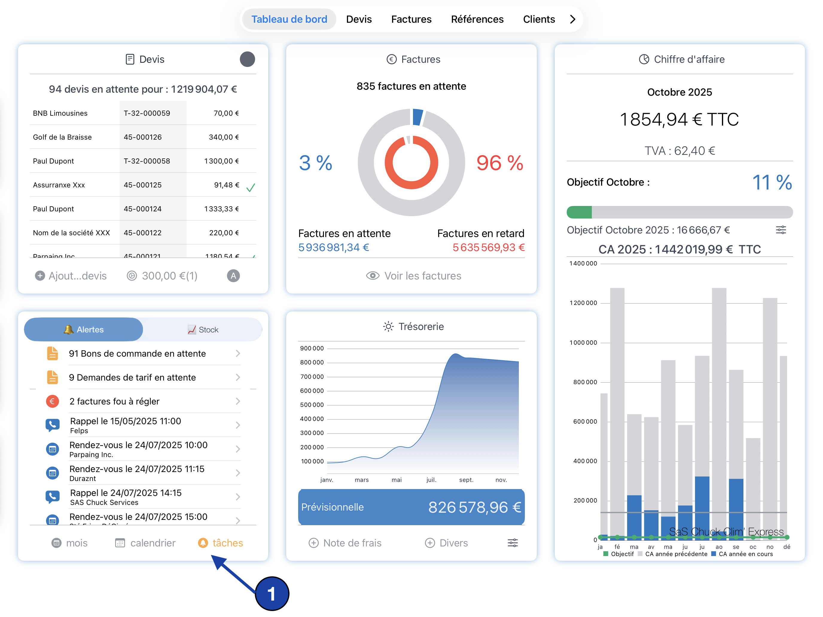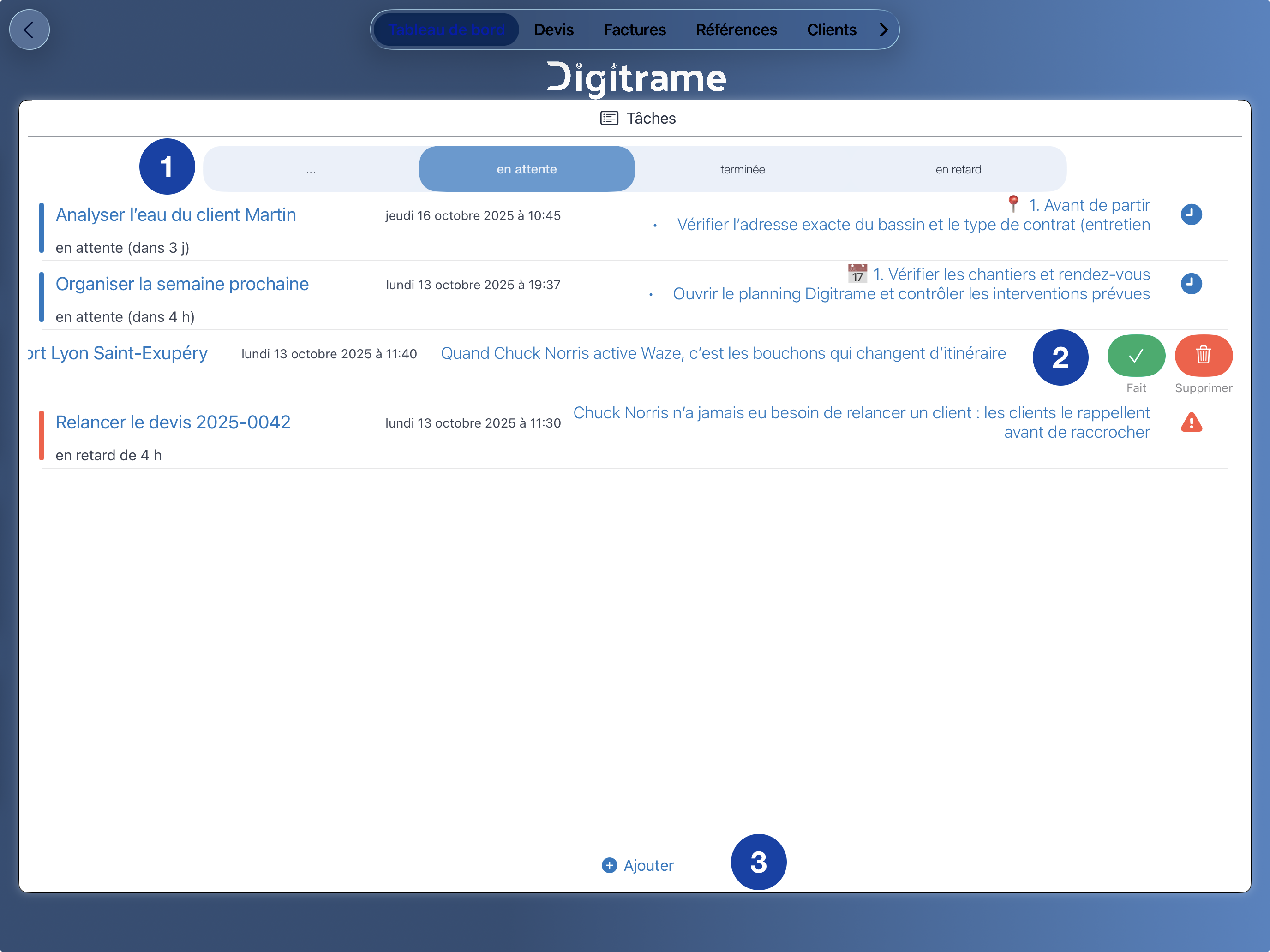 Créer rapidement une tâche (ex. “Préparer la facture du devis 2025-034”, “Commander le matériel pour le chantier Martin”).
