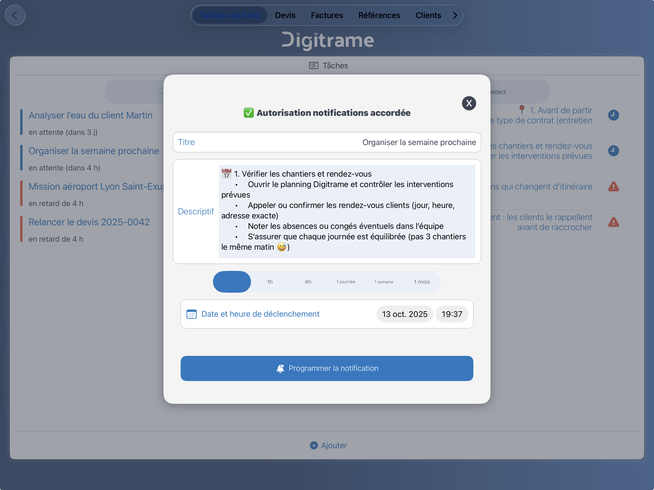 L’objectif est de centraliser vos rappels, vos actions et vos priorités directement dans Digitrame, pour ne rien oublier — que vous soyez sur chantier, en déplacement ou au bureau.