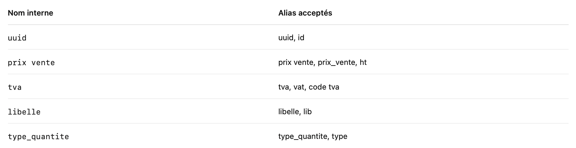 Pour maximiser la compatibilité, Digitrame accepte plusieurs noms possibles pour une même colonne.