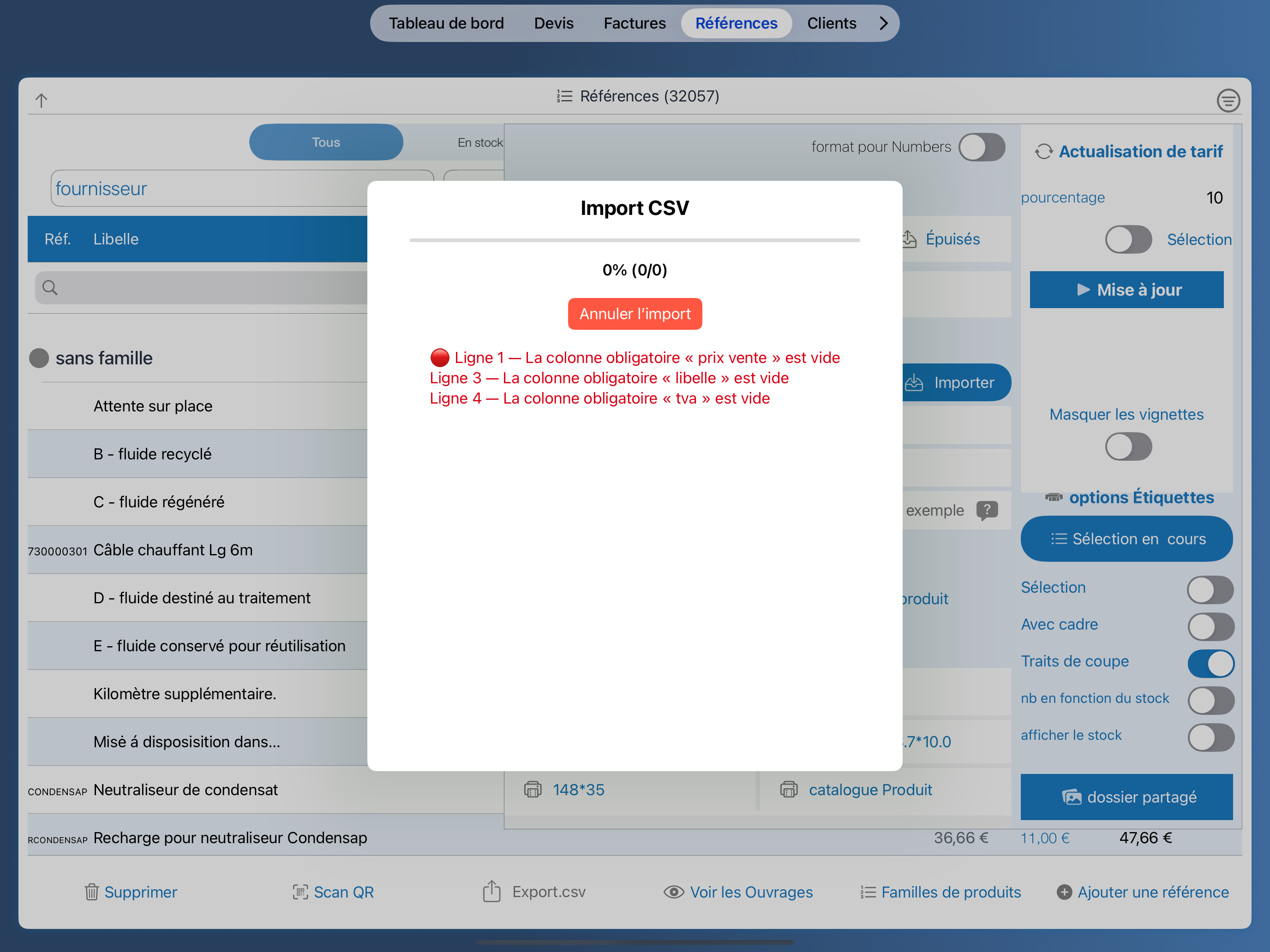 L’importation de références via un fichier CSV est une fonctionnalité permettant d’intégrer rapidement des catalogues fournisseurs, des listes de produits, ou des mises à jour massives.