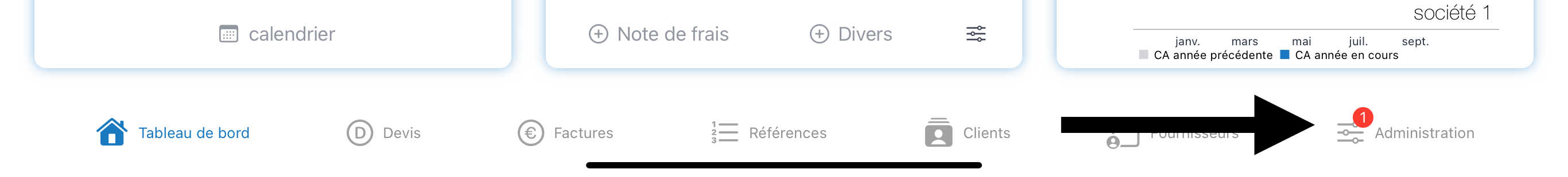 Le tableau de bord c'est votre écran principal pour le suivi de votre activité. Une synthèse de l'ensemble de votre activité commerciale avec vos principaux indicateurs. 1. Devis en attente 2. Factures en attentes et en retard 3. Chiffre d'Affaires ...